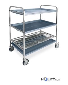 Wagen zum Abtropfen von Tellern und Gläsern mit 3 Ablagen, darunter 2 Abtropfablagen für Tellr und 1 Glasabtropfablage. Abmessungen: B. 102 x T. 69 x H. 134 cm.