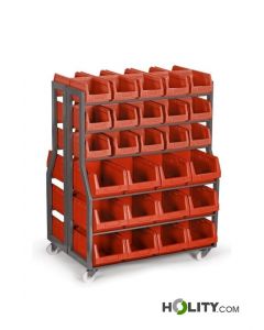 Mobiles Stahlregal mit Polypropylen-Behältern: 30 Behälter à 4 Liter und 24 Behälter à 10 Liter. Maße: B 88 × T 60 × H 120 cm.