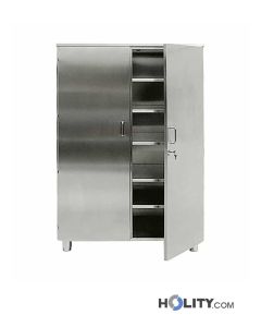 Es gibt Schränke aus Edelstahl mit Schiebe- oder Flügeltüren, die mit Schubladen, Regalen und Fächern ausgestattet sind, um das Material im Inneren besser zu organisieren.
