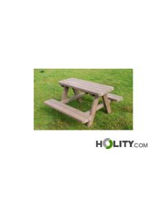 Kinderpicknicktisch aus imprägnierter Kiefer und Bänke mit Rückenlehne. Abmessungen: B 163 x T 120 x H 55 cm.